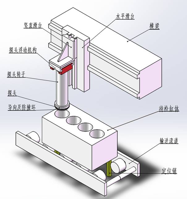 本設(shè)備由儀器系統(tǒng)、旋轉(zhuǎn)探頭系統(tǒng)、探頭伺服系統(tǒng)(包括探頭浮動裝置)、檢測定位系統(tǒng)、電氣控制系統(tǒng)等組成。為適應(yīng)可能存在的較大形位公差,本設(shè)備設(shè)計(jì)有探頭導(dǎo)向裝置、防撞裝置和探頭浮動裝置。這一裝置可允許缸孔相對于定位銷孔的位置公差高達(dá)正負(fù)5mm。同時,當(dāng)缸體的位置與缸體的定位綜合公差超出這個范圍時防撞裝置可自動啟動中止程序,以避免損壞缸體和本設(shè)備。